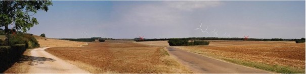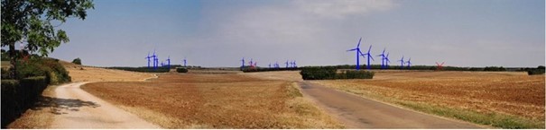 • Pour terminer le montage, il suffit de retirer le modèle numérique de terrain et de laisser les éoliennes simulées. Enfin, pour finaliser le photomontage, à l’aide d’un logiciel de retouche d’images, les parties d’éoliennes cachées par la végétation ou le bâti sont effacées.