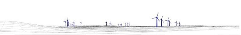 • Calage du modèle numérique avec la prise de vue d’origine : les éoliennes en bleu sont schématiques, le positionnement, les hauteurs d’éoliennes sont conformes à la réalité, mais il n’est pas possible d’ajuster les caractéristiques de la machine (largeur du mât, dessin du rotor), ni l’orientation des pales contrairement au mode rendu.