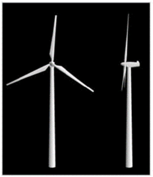 • Habillage de la représentation numérique de l’éolienne. Pour un rendu plus réaliste, les éoliennes ainsi simulées peuvent être colorées selon une nuance de blanc ou de gris, celle qui sera utilisée dans la réalité. L’orientation et l’intensité de la lumière sont également simulées. Notons que les rotors sont représentés dans le scénario d'impact visuel maximal, c'est-à-dire quand le vent arrive du dos de l'observateur.